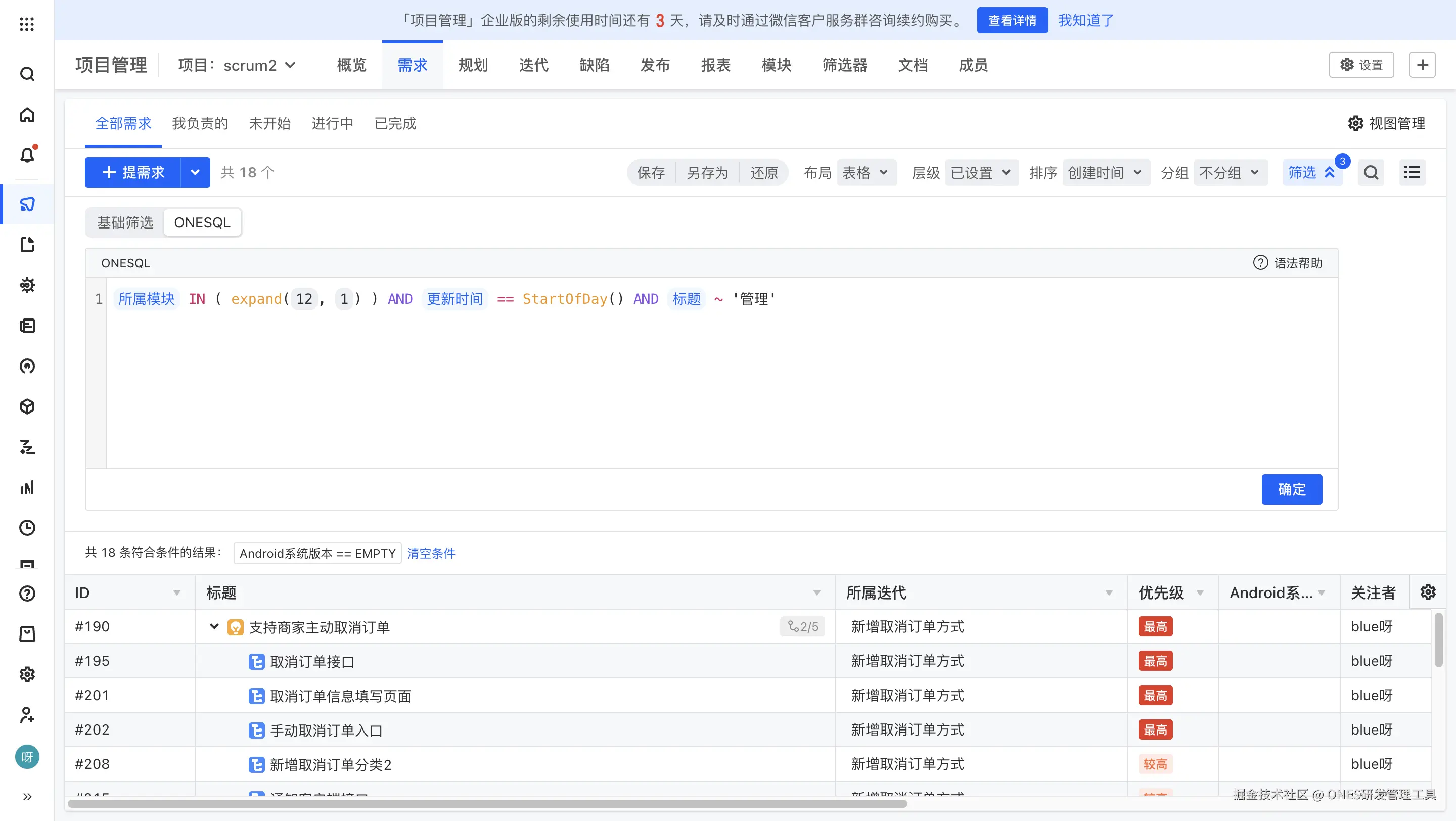 对于来自 Jira 等平台的用户,其原有的高级查询语法(如 JQL)也可无缝衔接至 ONESQL,实现筛选逻辑的平滑迁移。