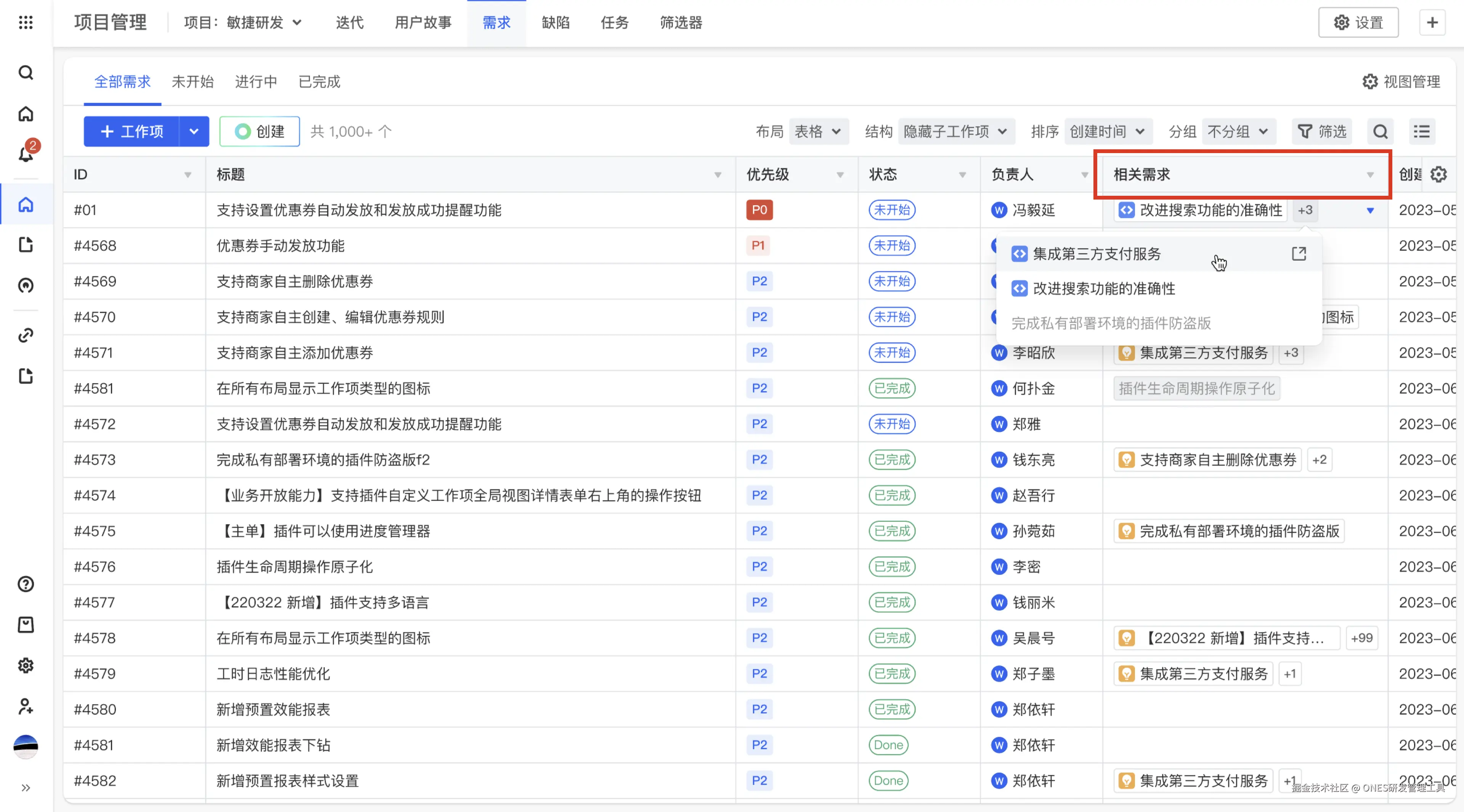 支持上下级工作项间自动触发条件校验与流程分支,例如:当所有子任务完成后,父任务的状态可自动更新为「可验收」,实现流程的自动化推进。