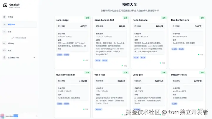 - 多模型成本极致优化:对于需要大量生成图片的独立创作者和团队来说,选择GrsAi能有效降本增效,模型包含Nano banana-0.022/张,sora2-0.08/条,sora-image-0.02/张,Veo3.1-0.4/条,Flux,gemini...包含图片,文本,视频模型。