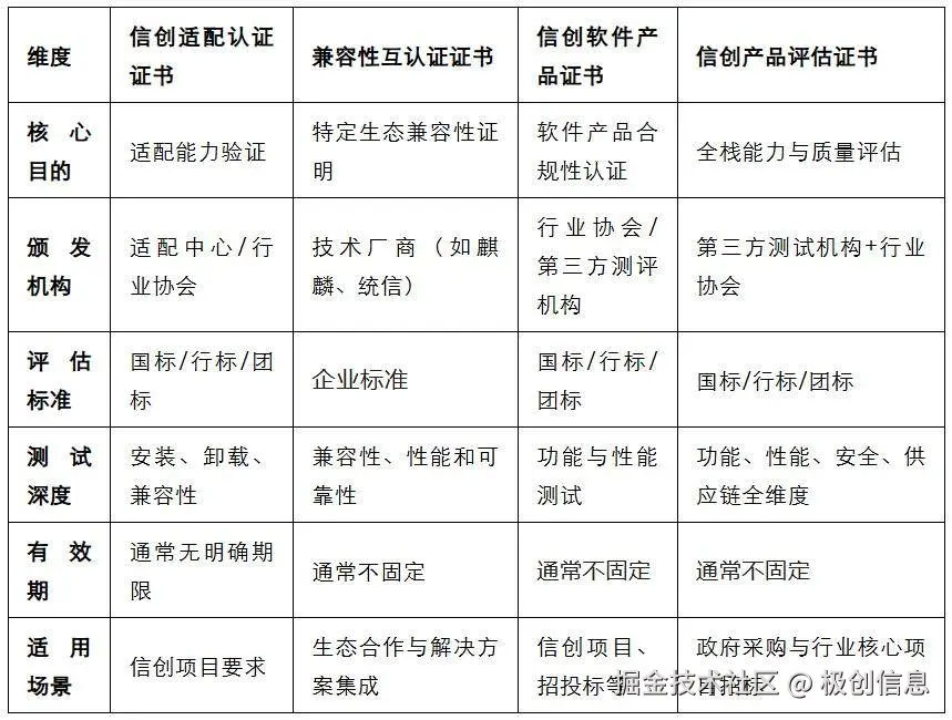 信创产品适配认证、评估认证、 信创软件产品证书、互认证书。 它们各有重点,也相互衔接,形成完整的国产化验证体系。