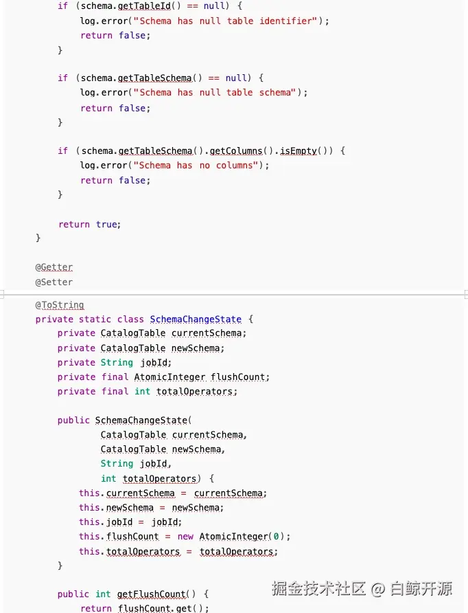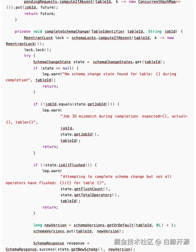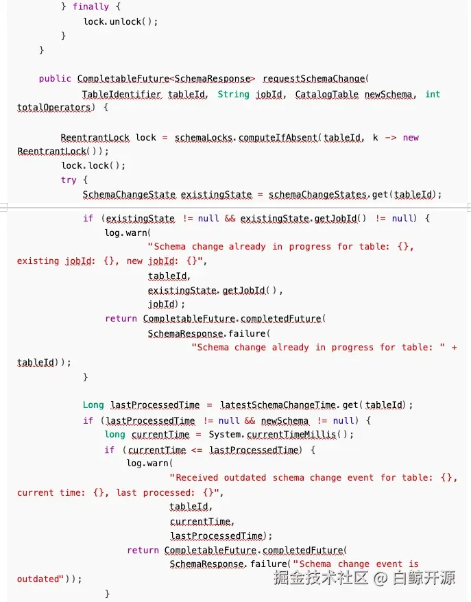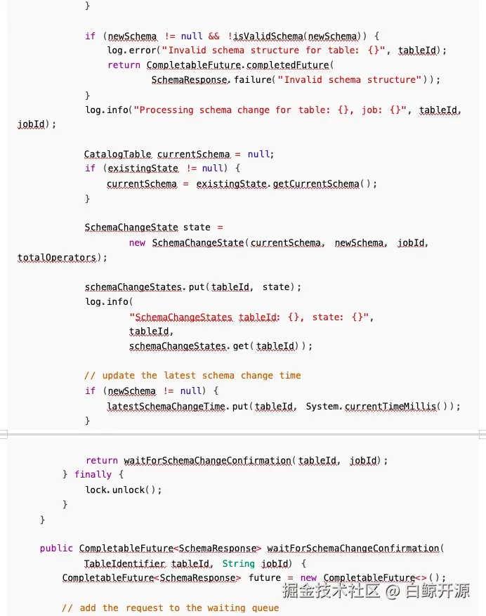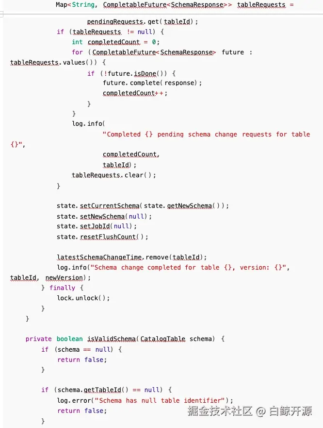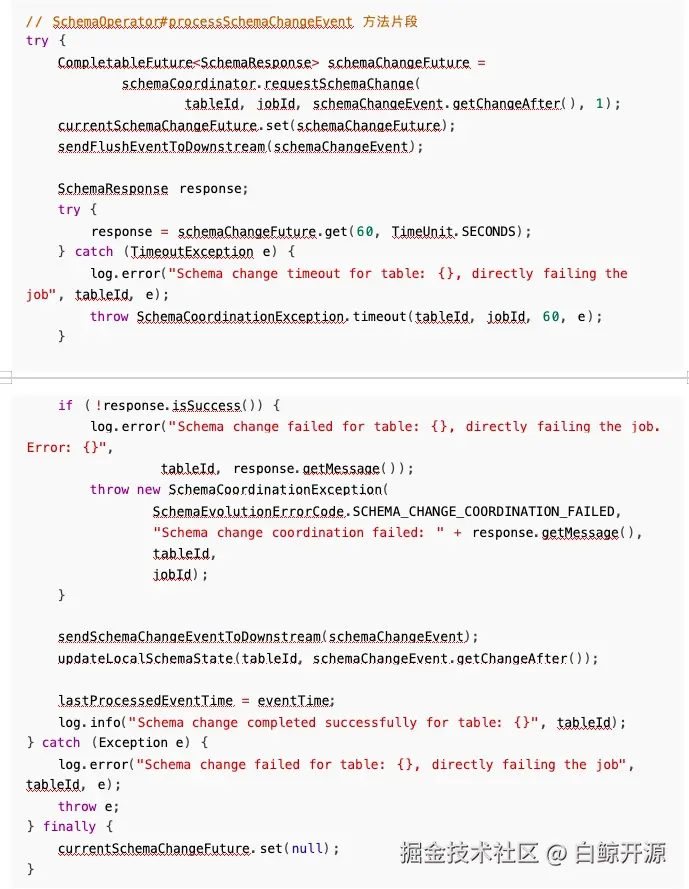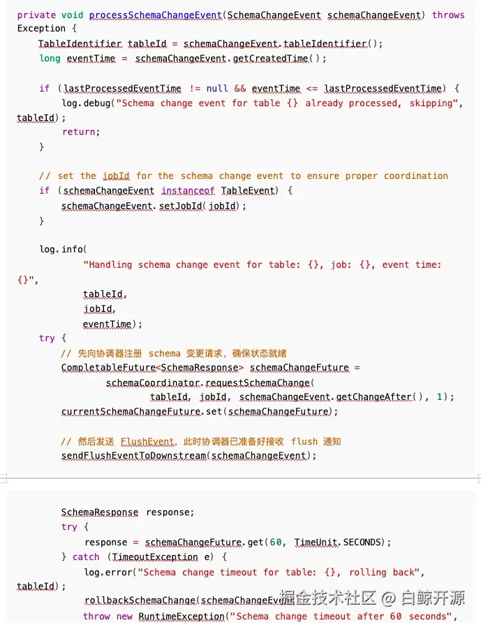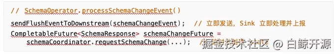 所以问题就比较明显, Sink 的 flush 通知比协调器的 requestSchemaChange 更早到达,导致通知 被丢弃,我们只需要修改执行顺序即可解决此问题: