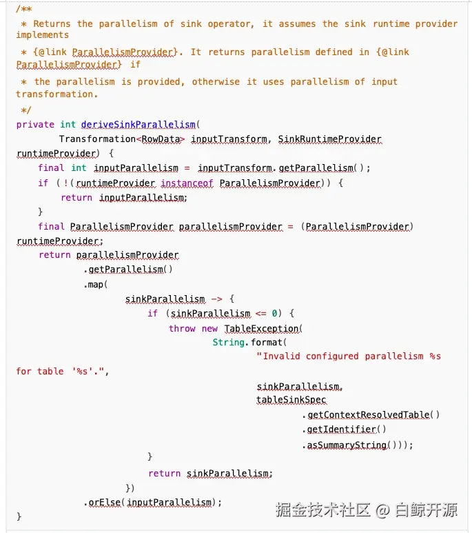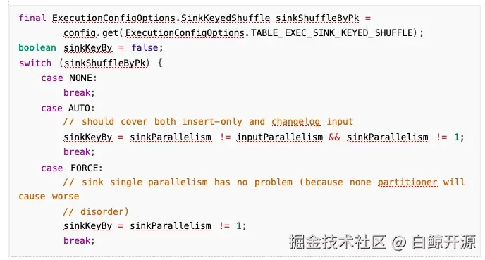 具体实现里面,会先检查 sink 端和 input 的并行度是否相同,如果不同,会采取 primary key shuffle 的手段: