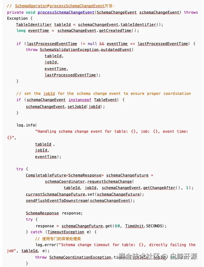 之前在 SchemaOperator 算子里面处理变更事件的时候,我先发送了刷写事件,之后才请求协调器 进行变更,这样会有一个问题,协调器内部的 SchemaChangeState 还没有进行初始化,所以之后协调 器迟迟获取不到 State,先一步到的 FluEvent 也没有被成功接收, 一直阻塞,之后任务超过了我设定的 超时时间,任务就失败了。 分析日志后发现: