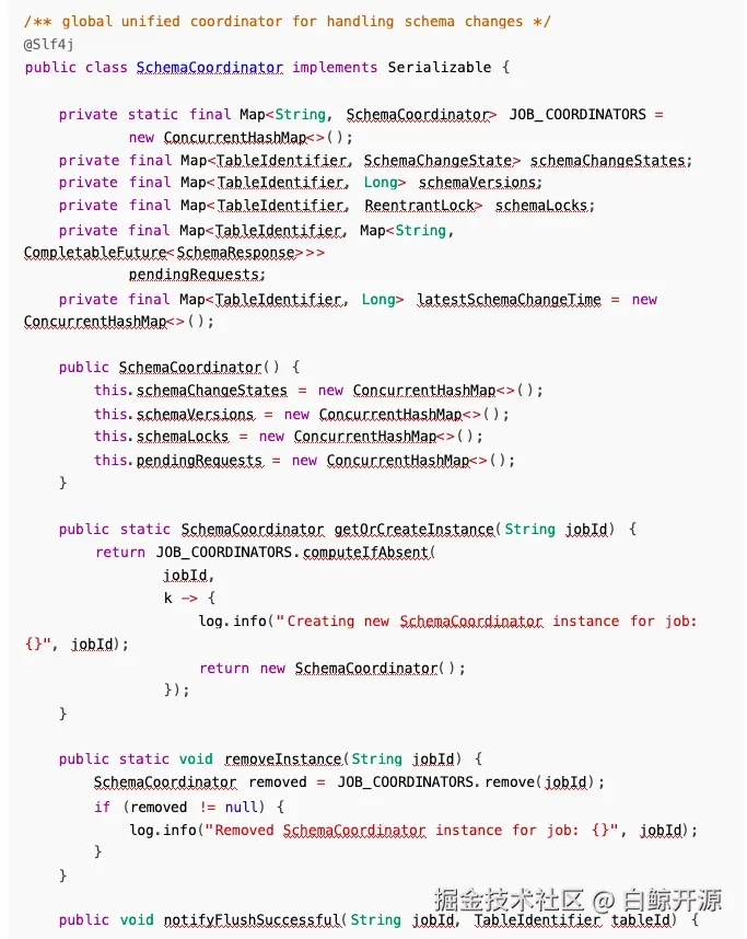 ✅实现 SchemaCoordiantor 协调器,接收 sink 端上报的刷写信息,同时接收 SchemaOperator 上 报的 Schema 变更请求。