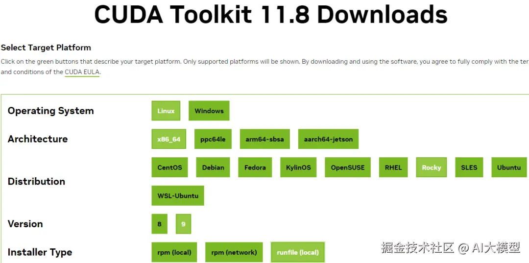 RTX 2080 Ti 的最优 CUDA 版本为 11.7 或 11.8,我们选择 11.8 版本下载,下载地址:developer.nvidia.com/cuda-toolki… ,找到对应的版本,选择合适的环境下载。下载后,文件存放到 /usr/local/src