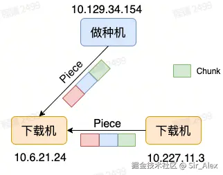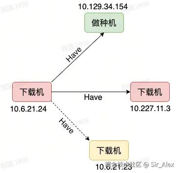 - 当所有Piece都下载好之后,则10.6.21.24即可为其他Peer提供所有Piece下载。