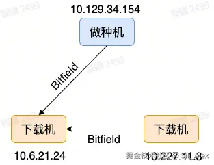 - 在发送完Handshake后,如果本地有当前种子对应文件的部分或者全部,则接着给对方发送Bitfield消息。上诉说过,P2P将分发的文件分隔成Piece,Bitfield消息则是表明当前Peer有哪些Piece。对于当前例子,Bitfield消息包含当前分发文件所有Piece。此时10.6.21.24会记录两个Peer都拥有所有的Piece。