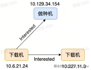 - 接着,10.6.21.24分别向10.129.34.154和10.227.11.3发送Interested消息,表示10.6.21.24对两个Peer拥有的Piece感兴趣。