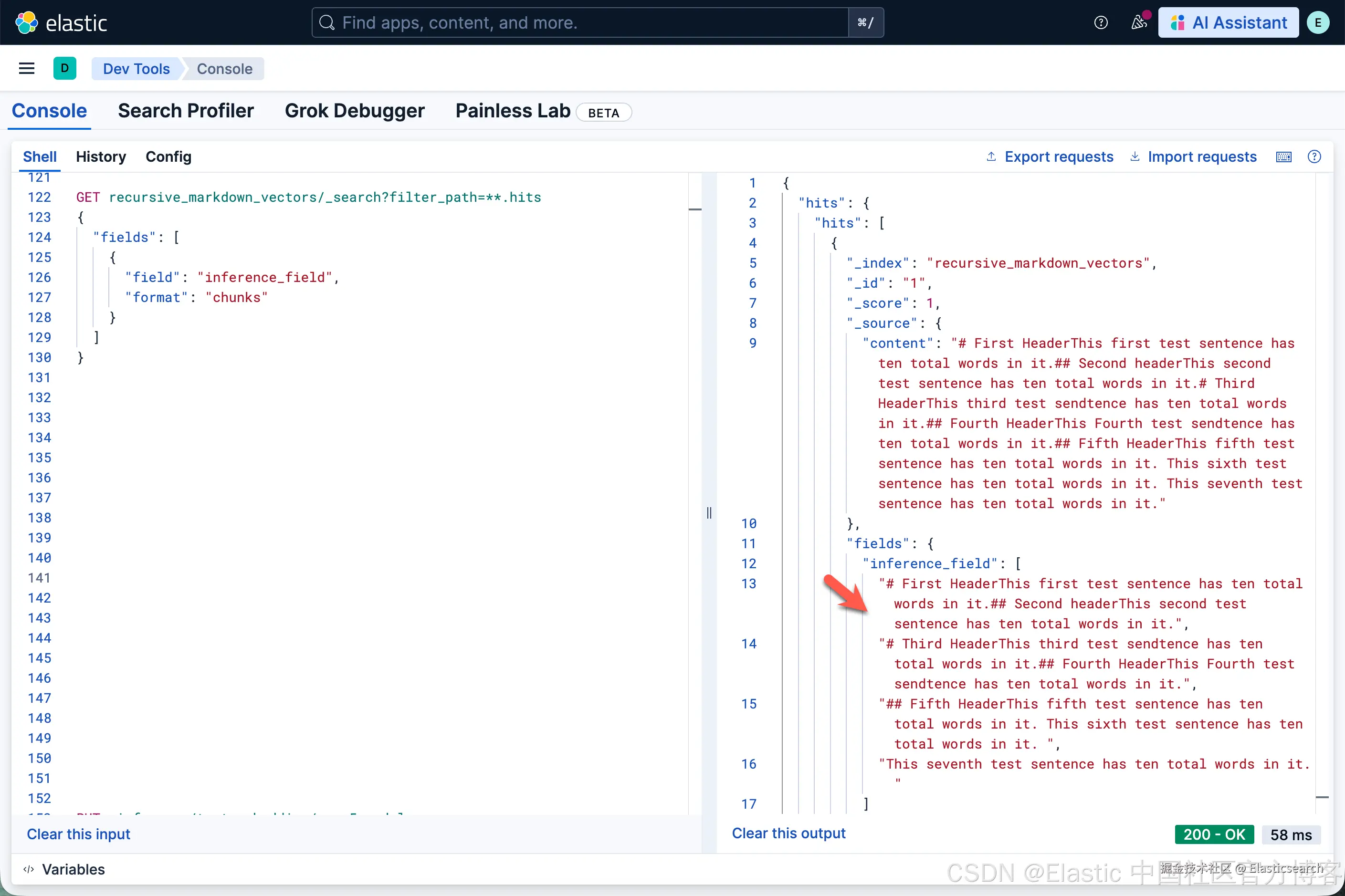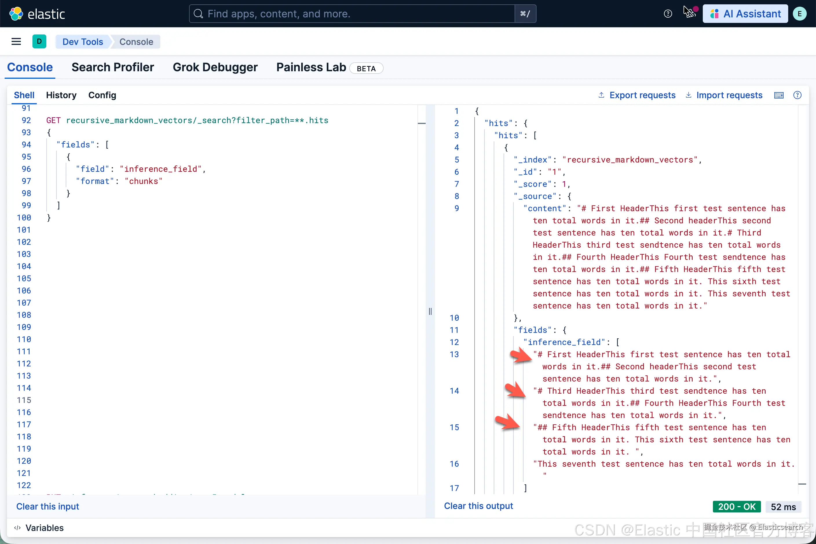 今天我发表的一篇文章 “在 Elasticsearch 中为结构化文档配置递归分块” 看着很简单。可能很多开发者还是不能得其要领,特别是在最新的版本中,我们的向量在默认的情况下是不在 source 里进行展示的。很难理解其中精髓。我在这篇文章里,使用一个具体的例子来进行展示。