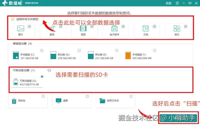 步骤1: 通过软件的扫描准备页面,选择需要恢复的数据类型和需要进行扫描的SD卡,做好全部扫描准备工作后,就能点击“扫描”;