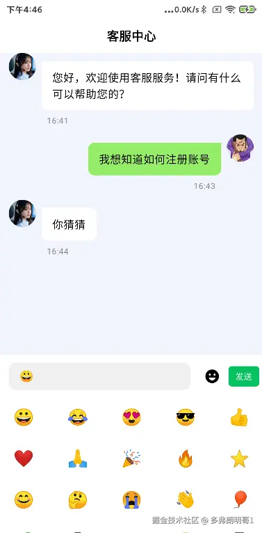 - 客服页。仿照常见的聊天页,有表情,能输入文字。