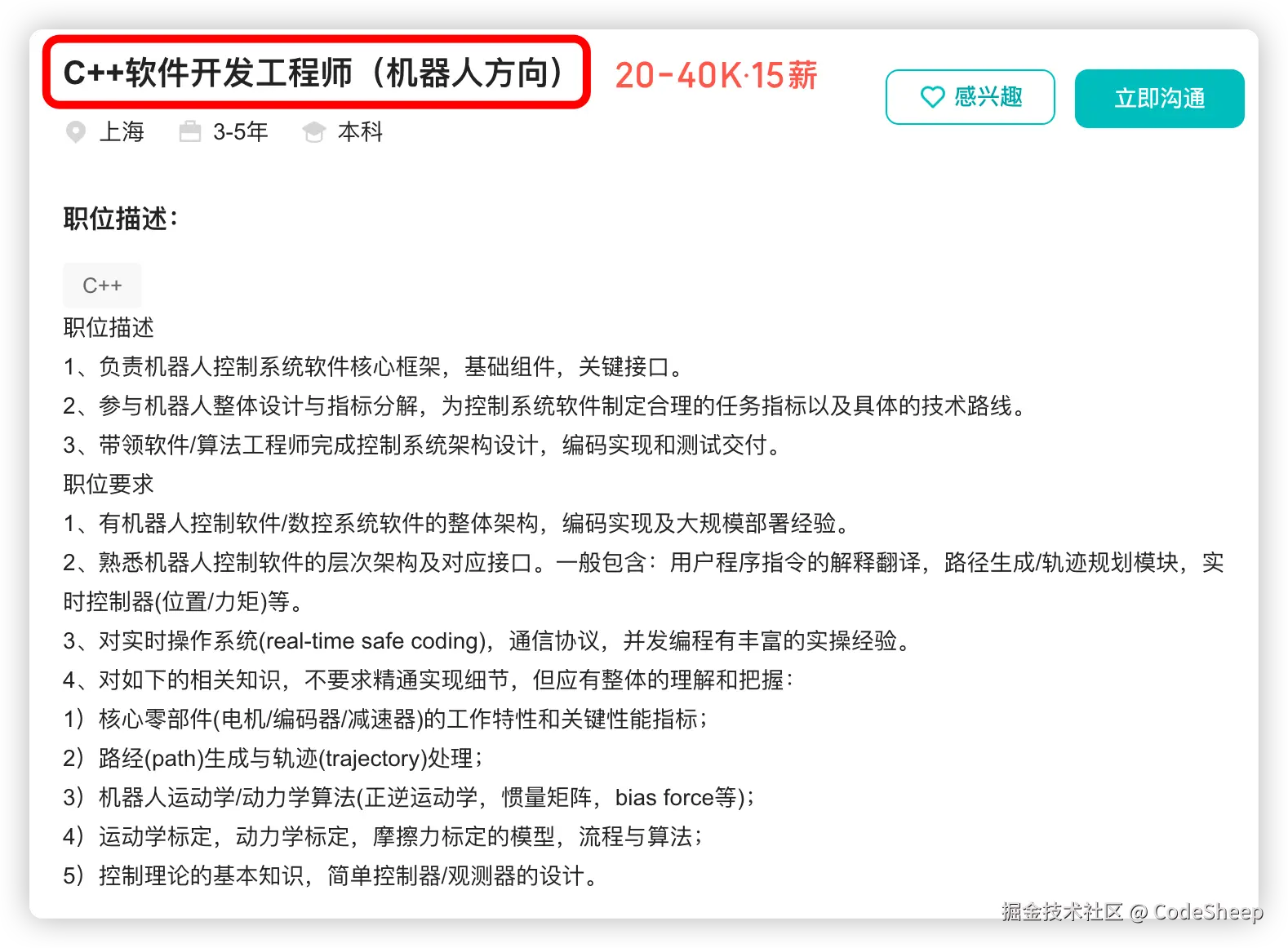 而类似于「C++软件开发工程师」这样的开发类岗位,其所要求的编码经验和工程能力也都是需要与机器人控制、通信协议、控制工程等强相关。