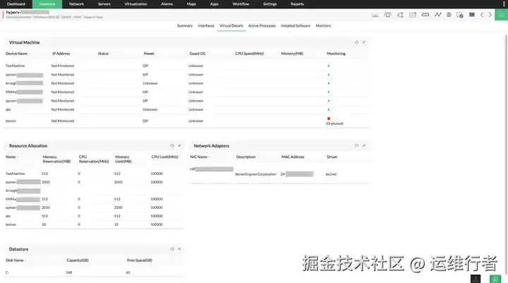 通过OPM的"虚拟化"模块,可实时查看虚拟机资源分配与使用状态,避免资源浪费或不足。在虚拟基础设施维护中,"僵尸虚拟机"(Zombie VMs,无实际用途却占用资源的虚拟机)与"虚拟机蔓延"是IT管理员的常见痛点。而OPM通过"主动库存探测"功能,可实时追踪"每台主机下的虚拟机列表"与"每台虚拟机的资源分配详情",堪称高效的Hyper-V库存管理工具。