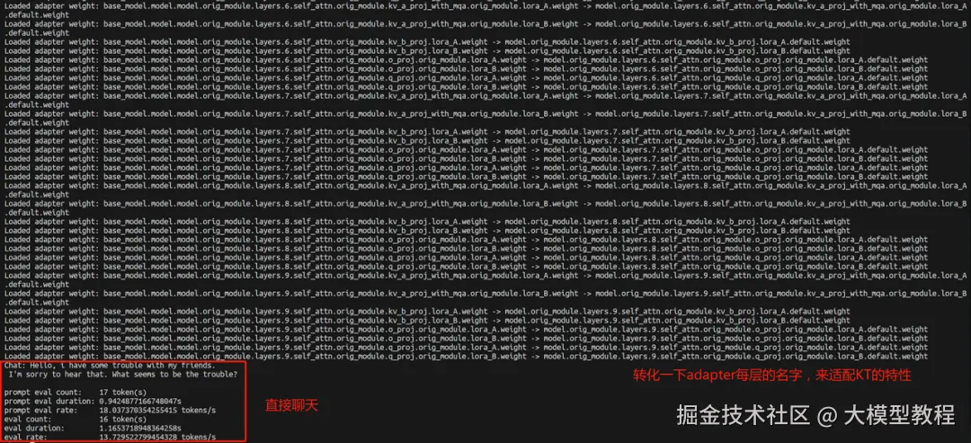 在加载过程中,LLaMA-Factory会将层名称映射到KT的命名规范。会看到类似 Loaded adapter weight: XXX -> XXX 的日志记录: