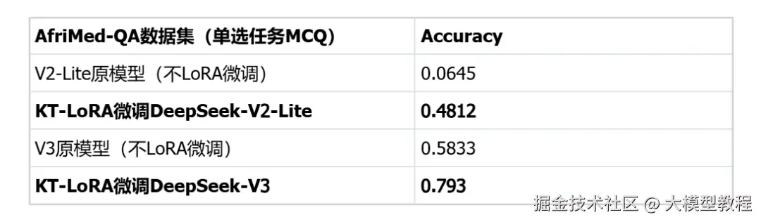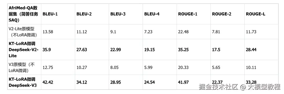在医疗垂直领域微调也十分有效,数据集采用非洲地区医疗领域的专用数据集AfriMed-QA(ACL-2025),具有很强的场景定制特征,包含单选题(MCQ)和简答题(SAQ)两种形式。评估标准上,SAQ用BLEU/ROUGE;MCQ用Accuracy。