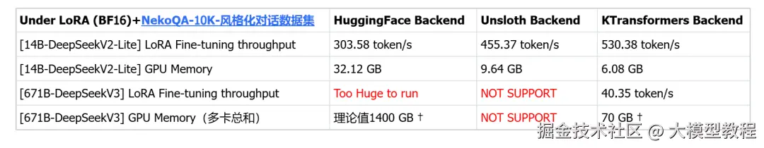 虽然LLaMA-Factory有HuggingFace默认后端、Unsloth后端以及KTransformers后端,但经团队对比测试,KTransformers是目前唯一能在2~4张 24GB 4090卡上微调671B规模MoE模型的方案;同时在14B规模的MoE模型上,相比另两种方案也具有更高的吞吐速率和更低的GPU显存占用。