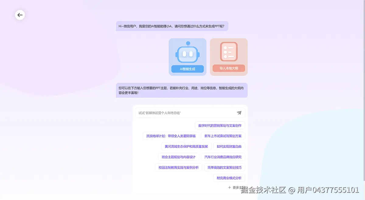 AiPPT 利用先进的AI技术,自动创建并优化PPT模版。AiPPT 的 AI 能为您生成适合的,高质量且独特的 PPT 模版。让你的演示更加专业和吸引人。