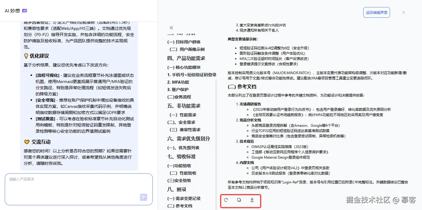 你只需要输入主题,AI就能一键生成结构清晰完整的产品文档。文档生成后,用户可以对生成的文档进行全文复制和下载,支持PDF、Word、Markdown多种格式,也可以再次输入需求让AI帮你优化文档,直接节约80%写作时间。