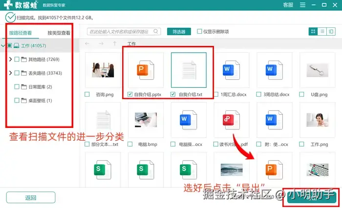 提示:扫描出来的文件已经被软件自动进行归类,可以在左侧的目录选择“路径”或者“类型”进行文件的进一步搜索哦。