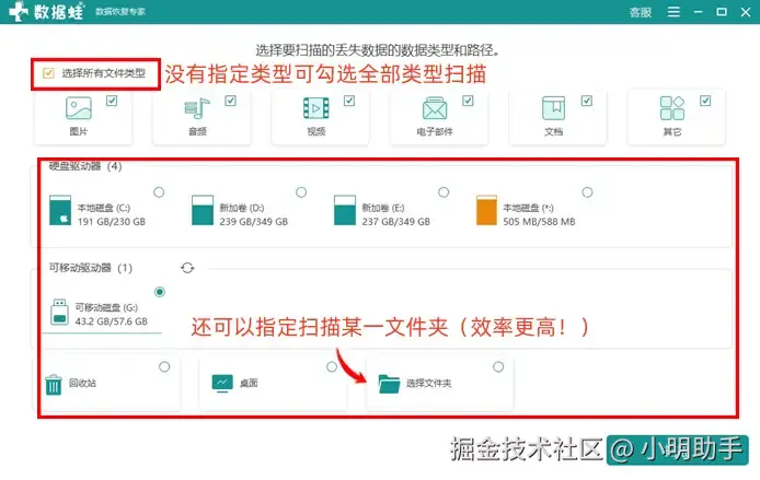 步骤1: 在首页的上方,我们可以选择所需恢复数据的类型;中下方则可以选择数据丢失的位置(还可以精确到某一个文件夹进行搜索),选择完毕后再按下“扫描”,开启软件的扫描进程;