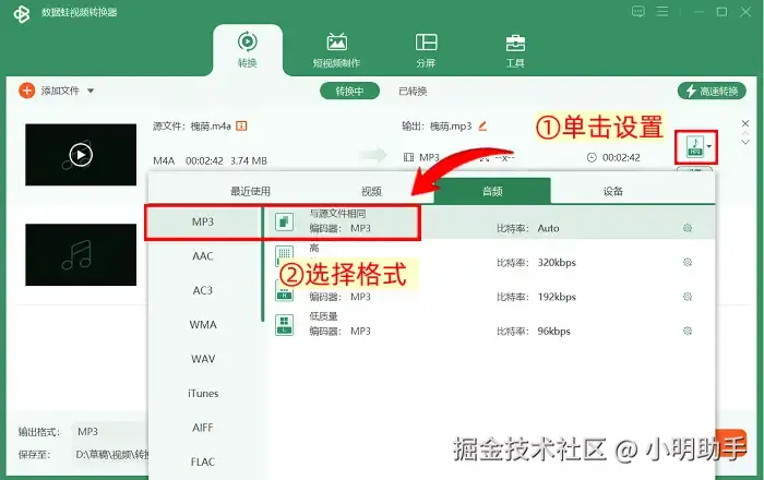 步骤2: 点击文件格式按钮,在打开的页面中,确认自己想要转换的格式与音频质量。