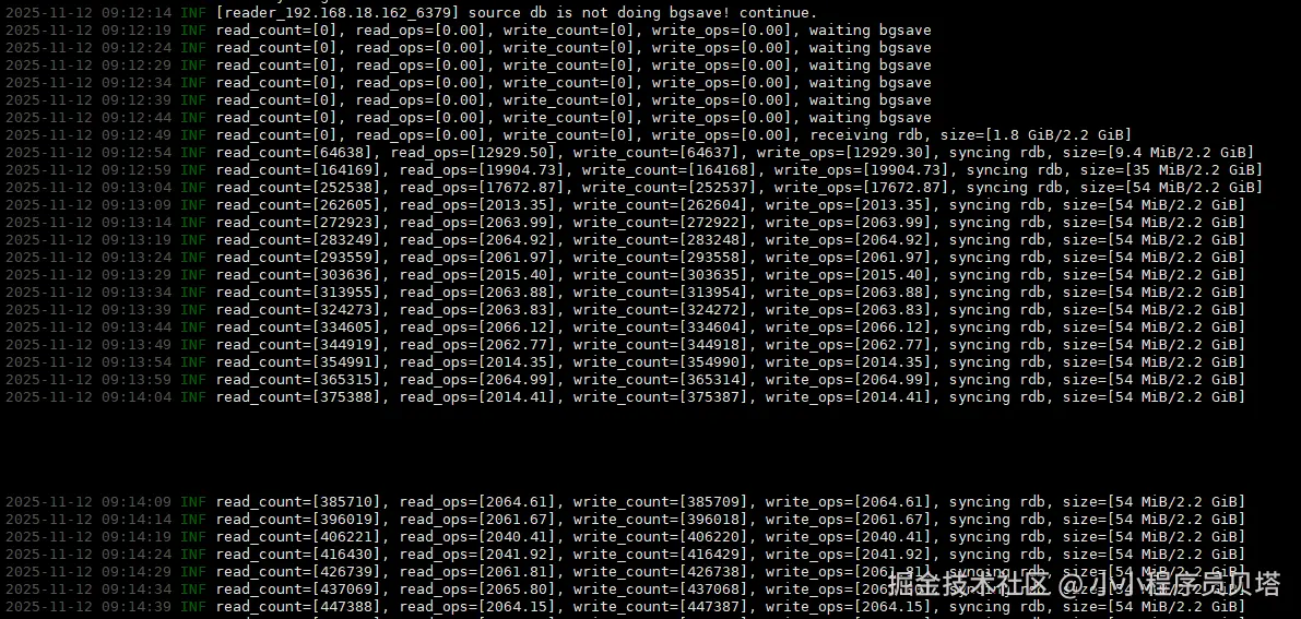 进程启动之后,会自动进行全量数据同步,如上面的原理分析一样,redis-shake会请求源redis进行数据同步,这次因为相当于是新增的redis副本,所以是一次全量的数据同步,源redis会后台进行bgsave生成rdb文件,之后传输给redis-shake, 同时源redis的增量数据会被源redis保存缓存,等待全量数据同步之后,自动会进行增量数据同步