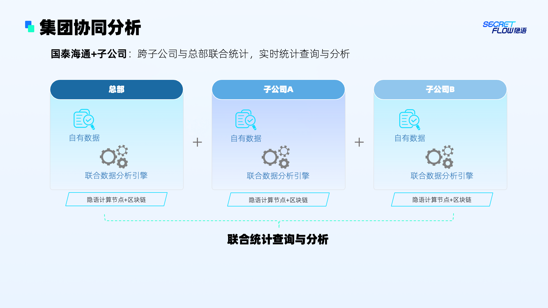 通过以上机制,实现了跨子公司资产联合统计分析,同时又能保证每一方的数据隐私不泄露,做到“最小数据暴露”。