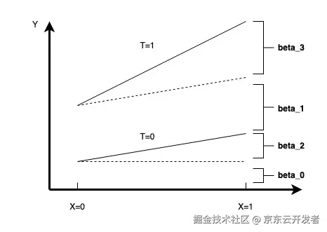Y=β0+β1∗T+β2∗X+β3∗X∗TY=β0+β1∗T+β2∗X+β3∗X∗T