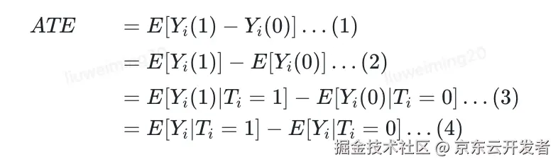 | ATE | Average Treatment Effect | 平均处理效应 | 所有实验对象的平均实验效果 | ATE=E[Y(1)−Y(0)]ATE=E[Y(1)−Y(0)] |