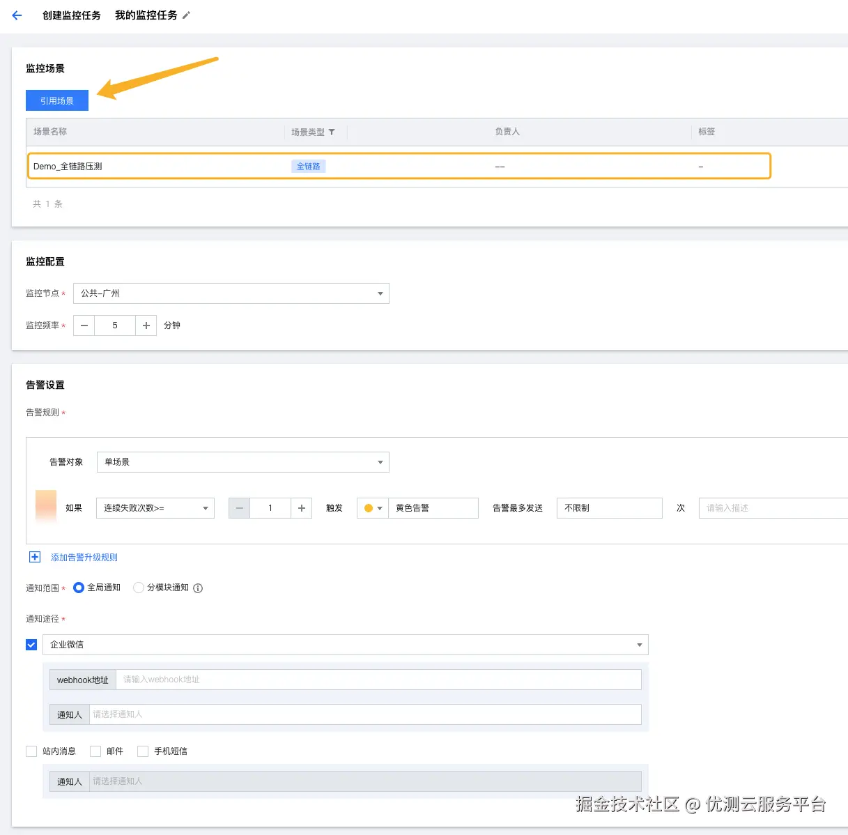 实时监控让您可以实时看到用户在您的网站上正在进行的操作。试想一下,如果您发现某个页面加载缓慢,并立即在客户流失前解决问题,那该有多好。在优测接口监控工具中,可以引用已创建的性能测试场景,即可实现分钟级接口监控,业务断言失败达到阈值,触发告警通知。