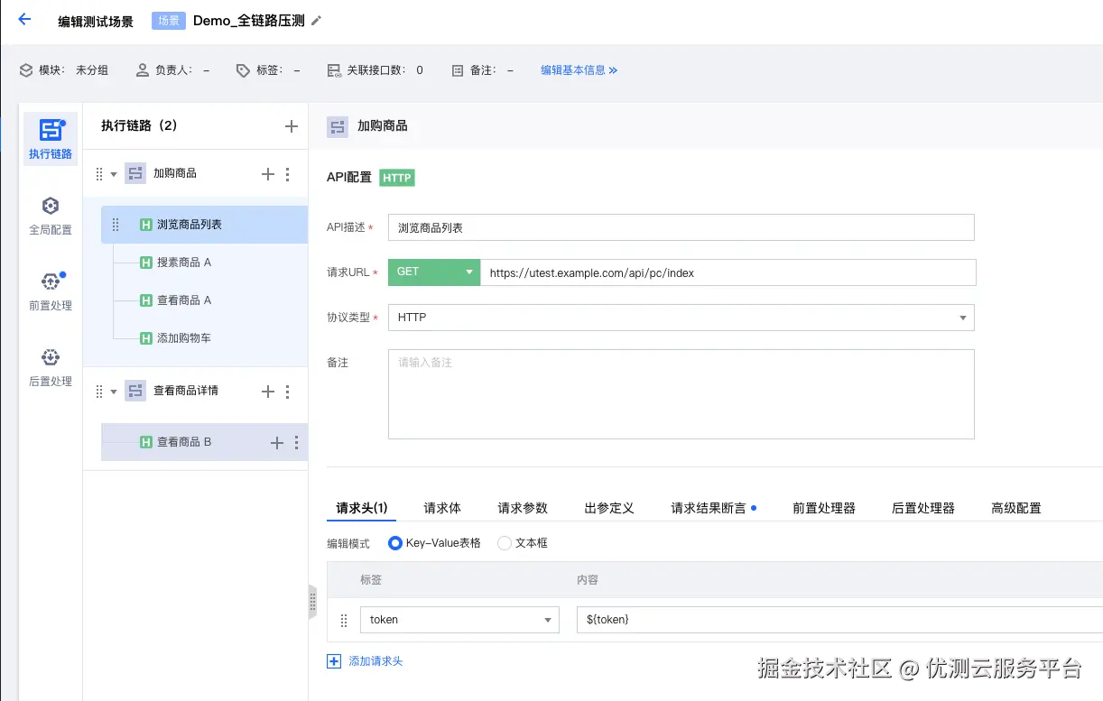 针对上述的业务场景,我们可以在优测的场景编排中组织这些API调用,并设置合理的思考时间和逻辑分支。根据业务逻辑,一部分用户在浏览产品A,另一部分用户在进行购买产品B的一系列操作,即两个业务是同时发生的,所以将它们设置为两个并行的链路,压测中会并行发起请求。