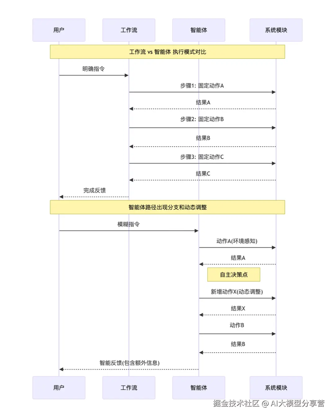 | 流程确定性 | 固定步骤,线性执行 | 动态调整,可能分支 |