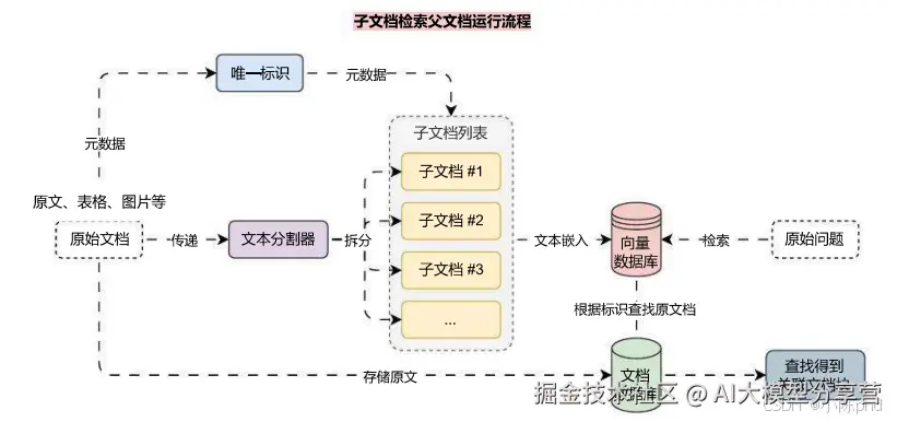 子文档->父文档的运行流程也非常简单,其实和 多向量检索器 一模一样,如下: