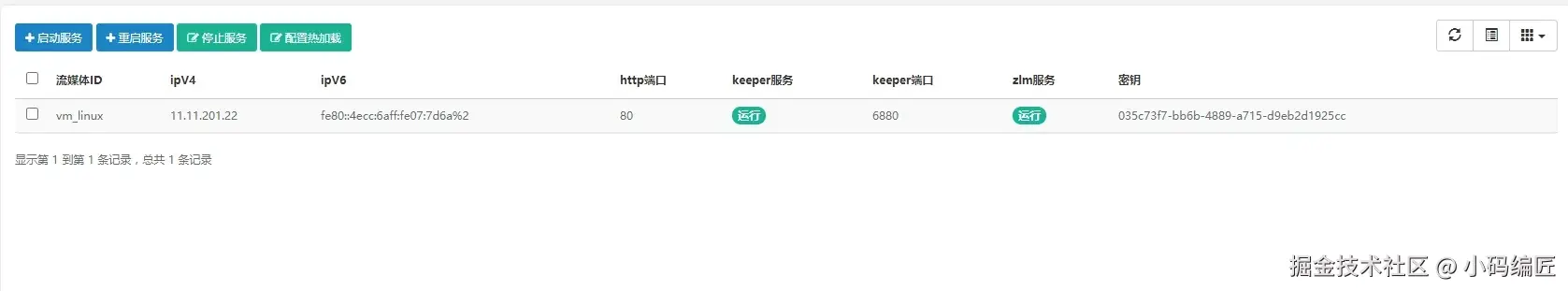 服务控制:提供流媒体服务的启动、重启、停止功能,并支持查看服务详情和热加载配置文件。