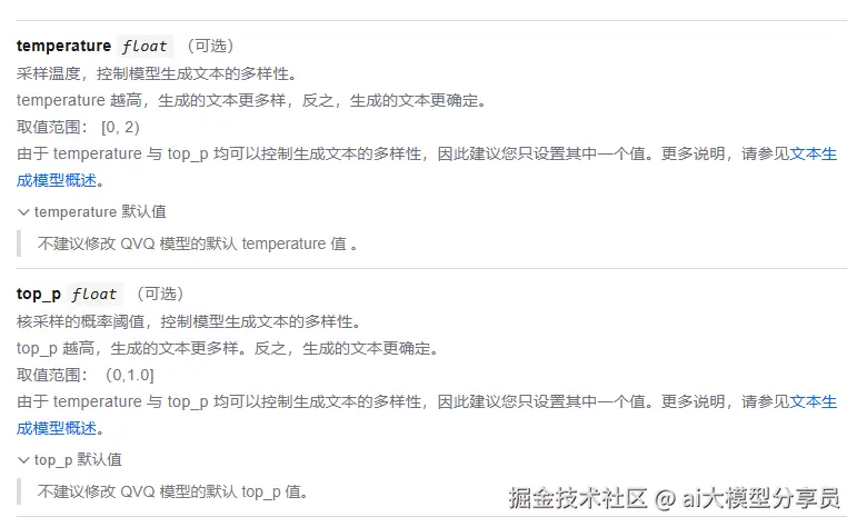 参考:进入阿里云的dashscope(dashscope.console.aliyun.com/),dashscope… API详情,然后找Temperature及Top P参数。