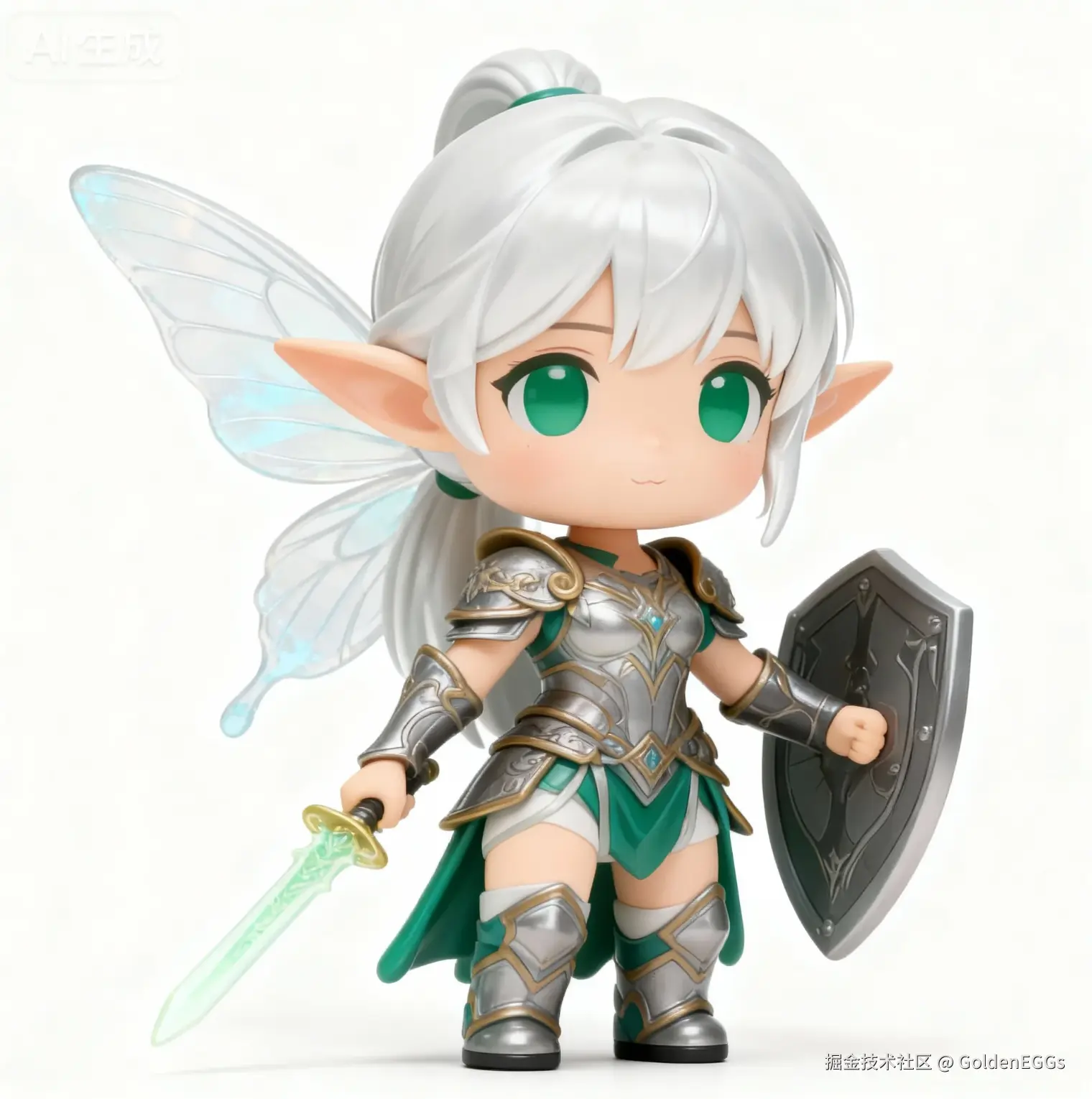 “卡通插画风格,一个来自精灵森林的光之精灵少女,她是精灵族的‘学者’。身材纤细,尖耳朵,长着透明蝶翼,蝶翼上有淡淡的蓝色光尘。她有一头银白色长发,扎成低马尾,瞳孔是翡翠绿色。性格文静好奇,穿着由树叶和藤蔓编织成的简易长袍,手里拿着一本发光的古籍。整体色调以森林系的绿色、白色和金色为主,光影柔和,充满生命感。”