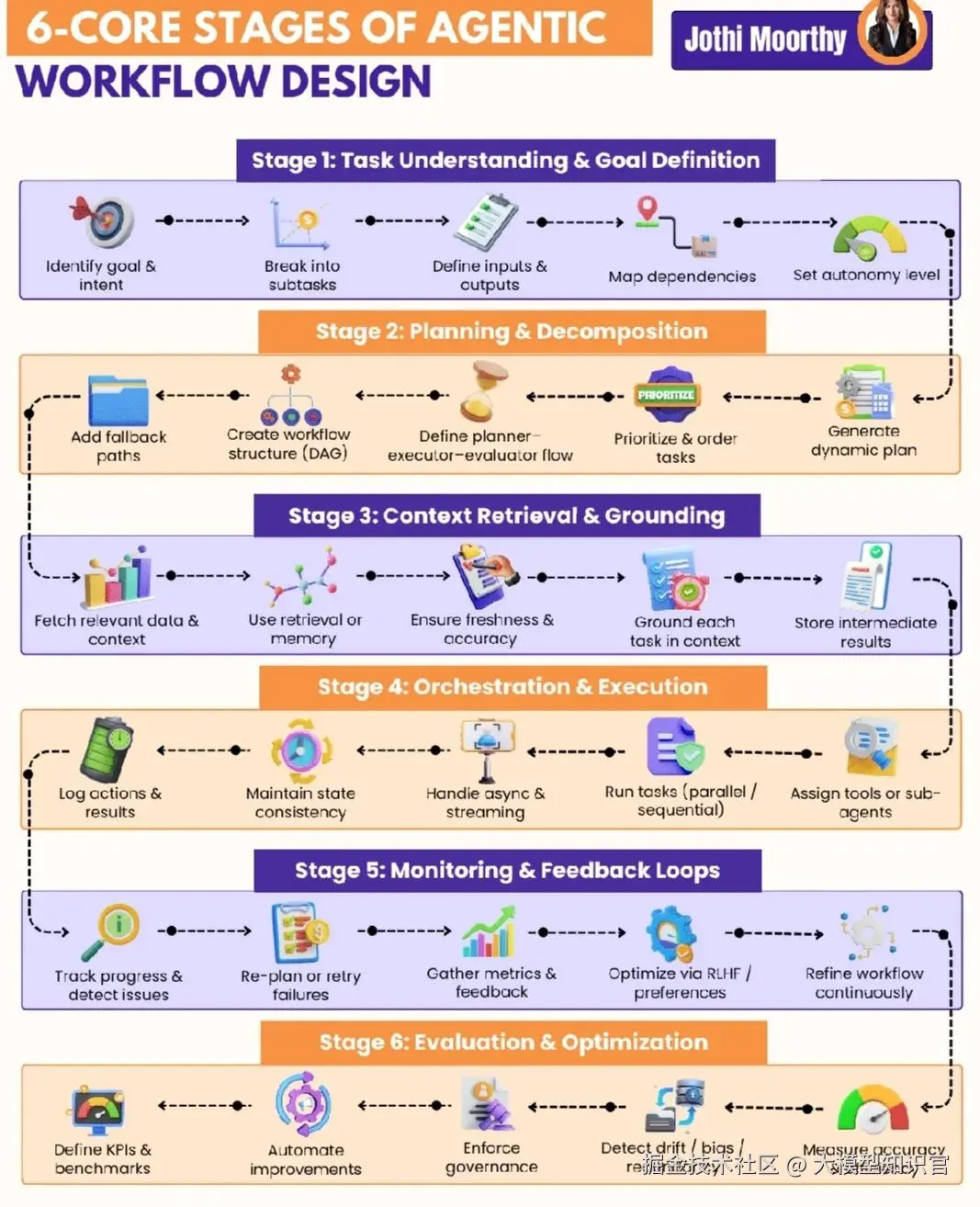 根据 Jothi Moorthy 提出的框架,以下是智能体工作流设计的 6 个核心阶段及其关键操作。