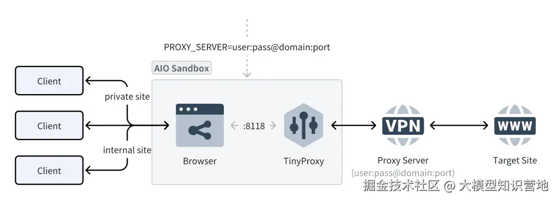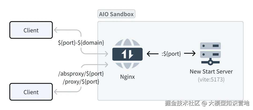 📡 代理与转发:支持带账密的正向代理;将{port}-{domain}** 泛域名或***/proxy|/absproxy/{port}***路径映射到沙箱内服务(便于预览/演示)。
