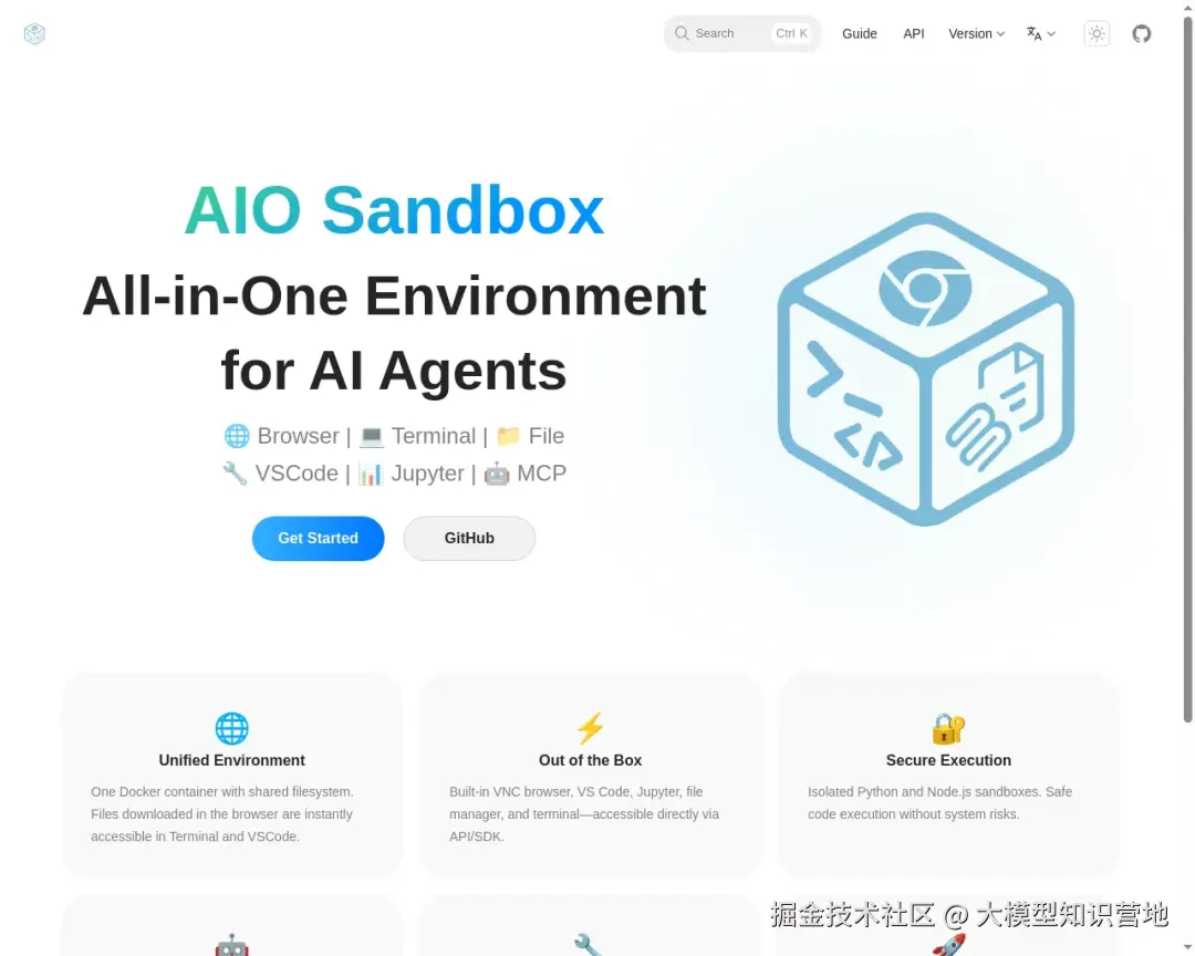 一句话介绍:AIO Sandbox 在一个沙盒内集成浏览器、代码执行、终端、可视化接管、正反向代理、MCP、鉴权等基础功能,可根据需求进行沙盒环境定制,让不同的 Agent“在一个环境容器内中更高效地完成任务”。