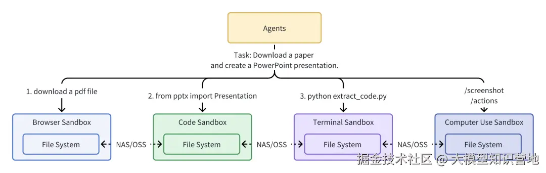 - **🧩 环境割裂:**多个单功能沙盒(如 E2B 支持代码执行,Browserbase 支持浏览器)迫使 Agent 通过 NAS/OSS 跨沙箱传输数据,增加延迟与复杂度。如:深度研究 Agent 完成『将一篇论文 Paper 做成 PPT』需在多沙箱间交换数十个中间文件(JSON 配置、图表图片、预览截图等),增加整个 Agent 系统复杂度和开销。