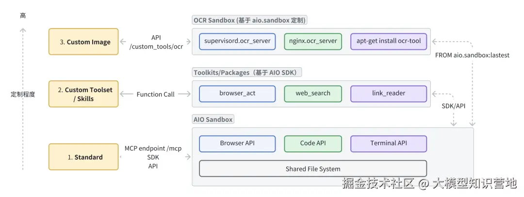 - **Custom Image(定制镜像):**基于 FROM aio.sandbox 基础镜像,安装特定的基础依赖(如多媒体/图像处理等),挂载自定义服务(例如 /custom_tools/ocr 图像识别)。