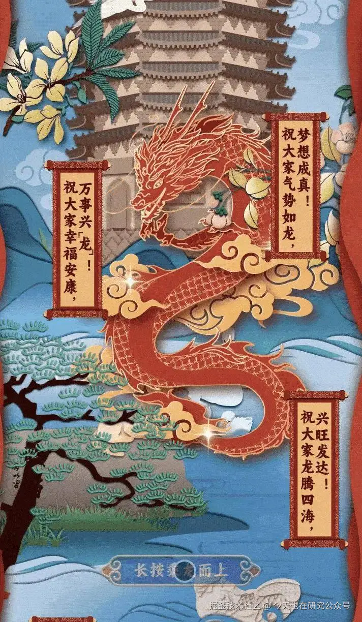 「长按差速上移」带年味:《龙腾四海起,光华迎春来!》里藏了个巧思——长按页面,新春元素会“分层”冒出来!灯笼、福字不是一起出现,而是有快有慢,像过年时街上渐次亮起的灯,氛围感直接拉满,用E2编辑器的对应组件就能复刻。