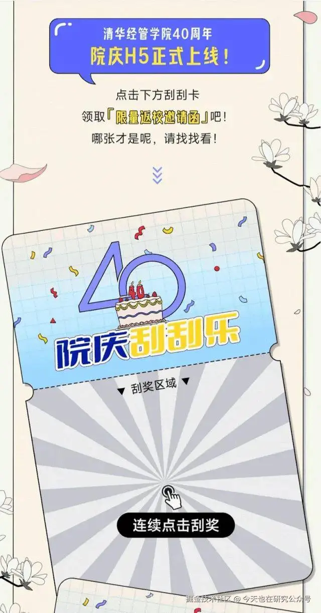 「渐进效果」做院庆刮刮乐:《回到与经管相遇的第一天》没搞复杂设计,就用简单的“刮刮乐”交互——连续点击刮奖区,就能解锁“限量返校邀请函”。关键是最后放二维码时,在组件里把属性设为“弹出图片”,用户长按就能保存,实用又有趣,证明“复杂≠优秀”,贴合场景才重要!