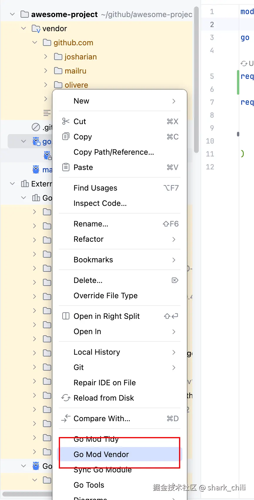 当然上述方案仅仅支持允许联网的情况,对于封网开发的读者可以通过go mod vendor将这个依赖直接缓存到本地进行调测开发: