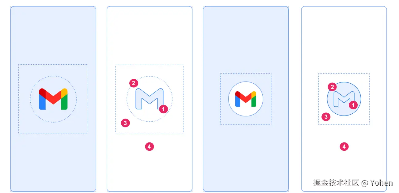 - 遮罩区域:启动画面中央的图标(前景层)会被按自适应图标规范进行裁剪(mask)。裁剪比例和自适应图标一样图标前景的边界约占总直径的 2/3(即留 1/3 的安全边距)。图标设计时不要画满整个圆,否则会被裁切。这样做的目的是保持视觉一致性,不同 App 的启动图标在 SplashScreen 中尺寸一致,不会显得不协调。