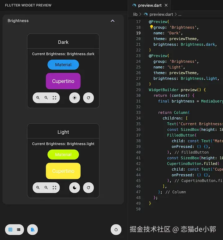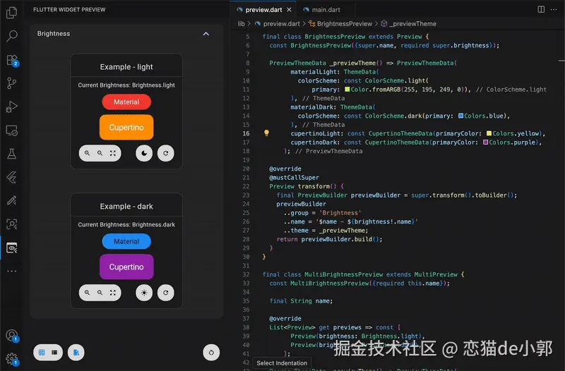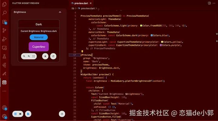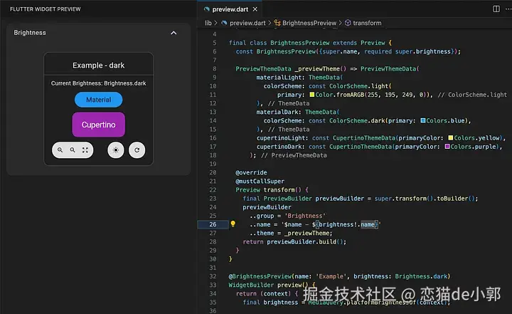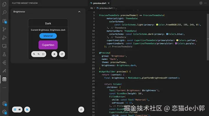Flutter 3.35 引入了 Widget Previews,而 Flutter 3.38 版本对 Widget Previews 进行了重大改进,包括 VSCode 和 Intellij / Android Studio 插件都已更新,初步支持 Widget Previews ,可以直接在 IDE 中查看预览: