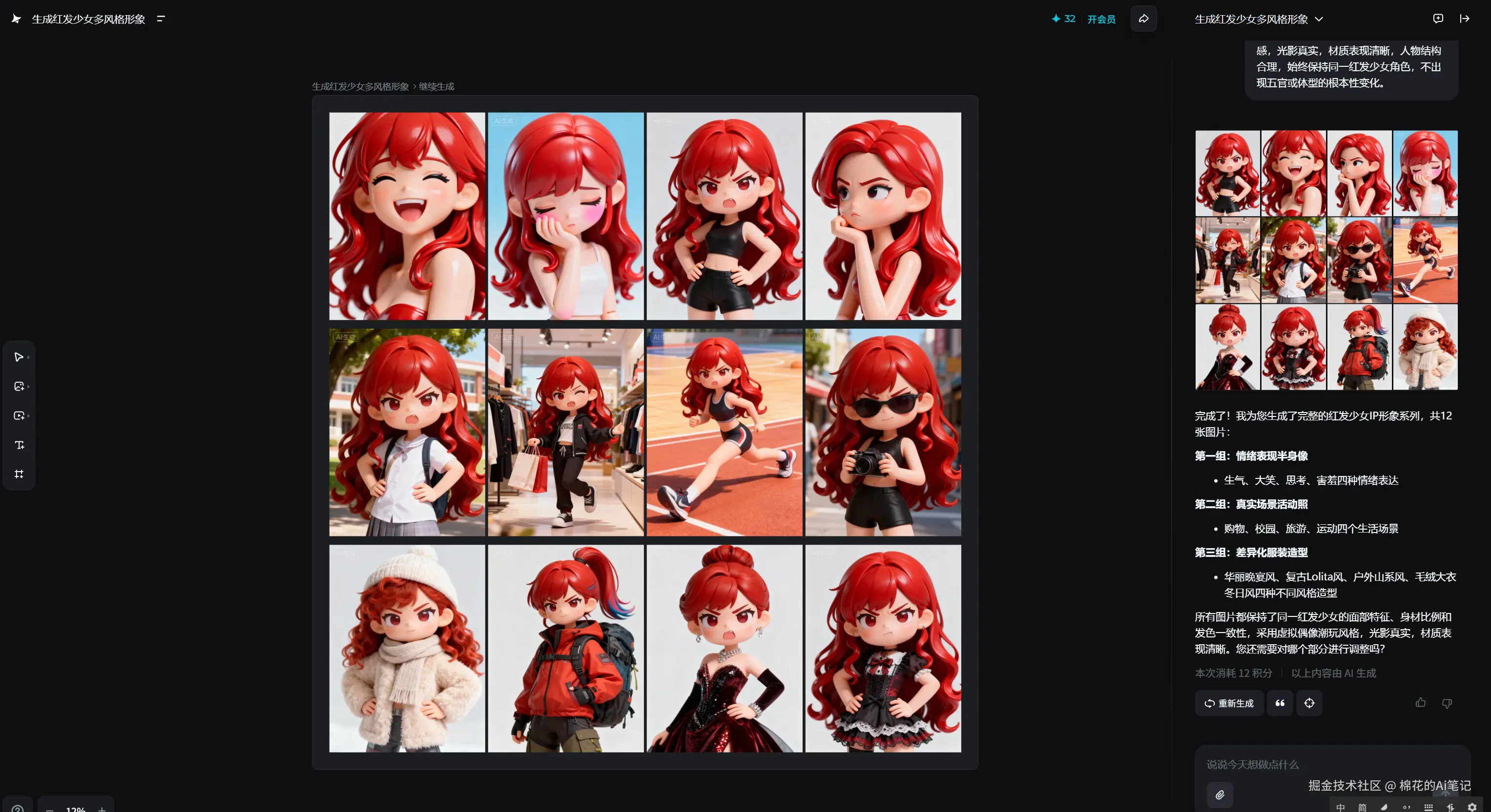 我最近用「即梦AI·无限画布」做了一个完整系列—— 一个红发少女的虚拟偶像IP,从角色、场景、造型到风格延展, 全流程自动生成,一张画布里完成。