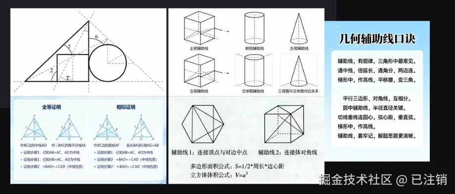 - 宝妈群体:从老大的几何图解、历史时间轴、学科手抄报,到老二的生字卡、英语字母绘本、口算习题,一套工具覆盖中小学全阶段;