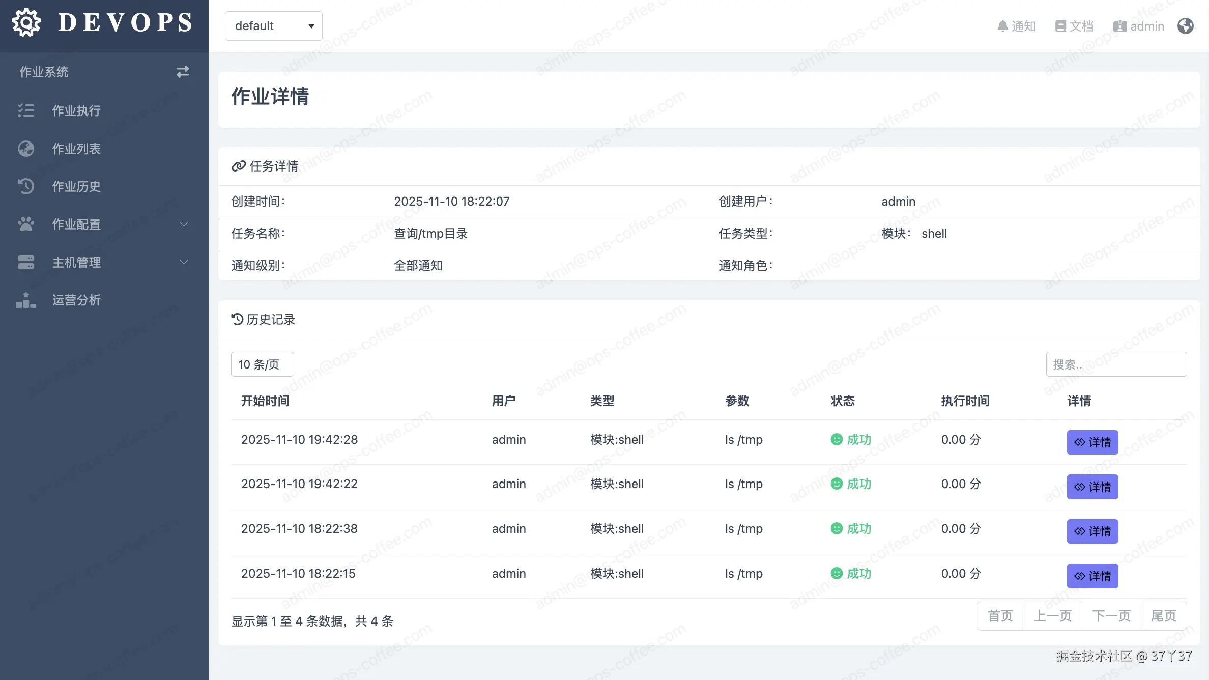 核心介绍:无论是作业执行还是作业列表触发的任务,其每一次执行都会产生一条历史记录。日志中详细记录了:创建人、执行时间、目标主机、任务状态(