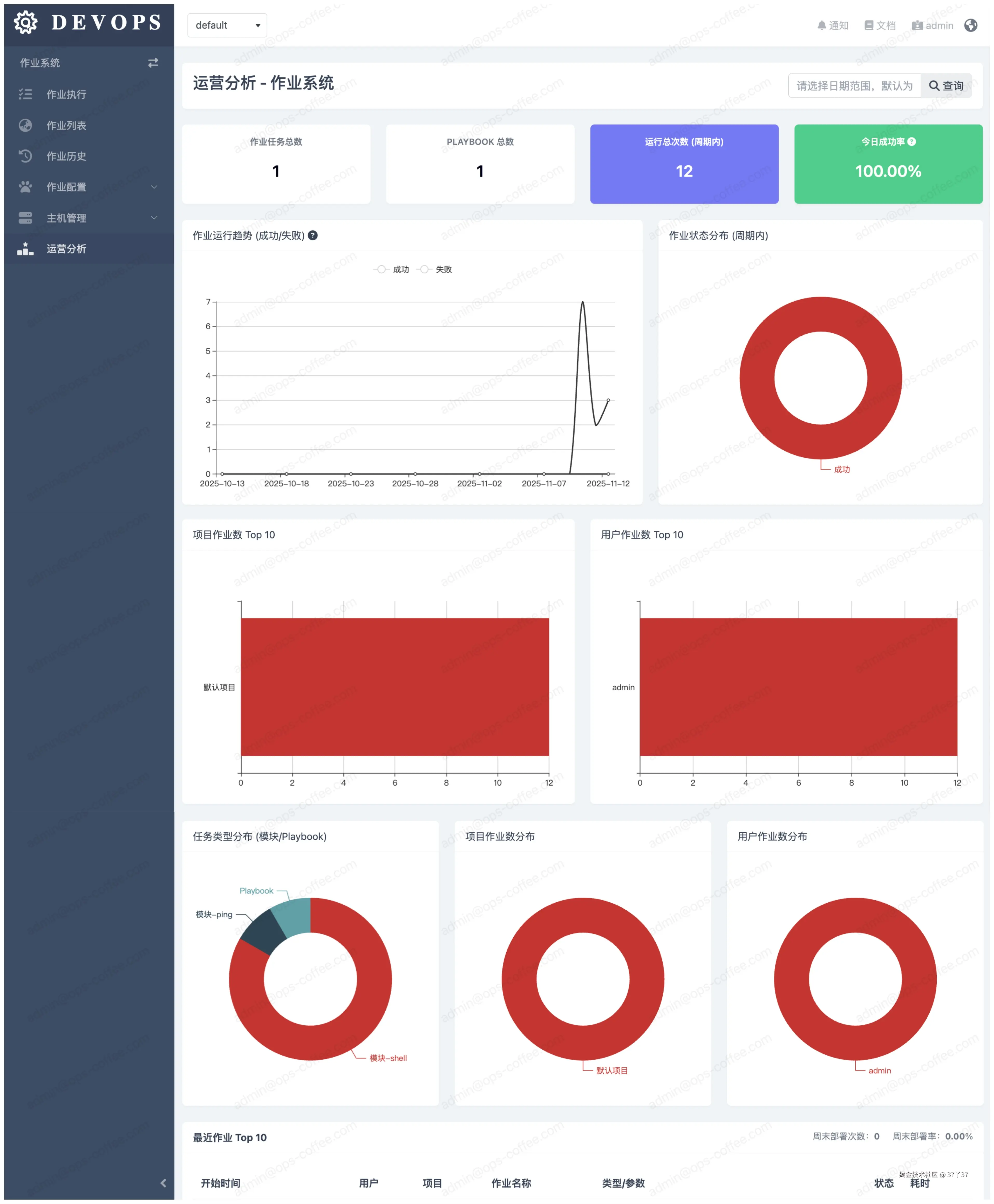核心介绍:汇总平台数据,从全局视角展示自动化平台的运营健康度。包括:作业成功率趋势、失败率Top10的作业、执行最耗时的作业、最常被执行的剧本、自动化覆盖的主机比例等。
